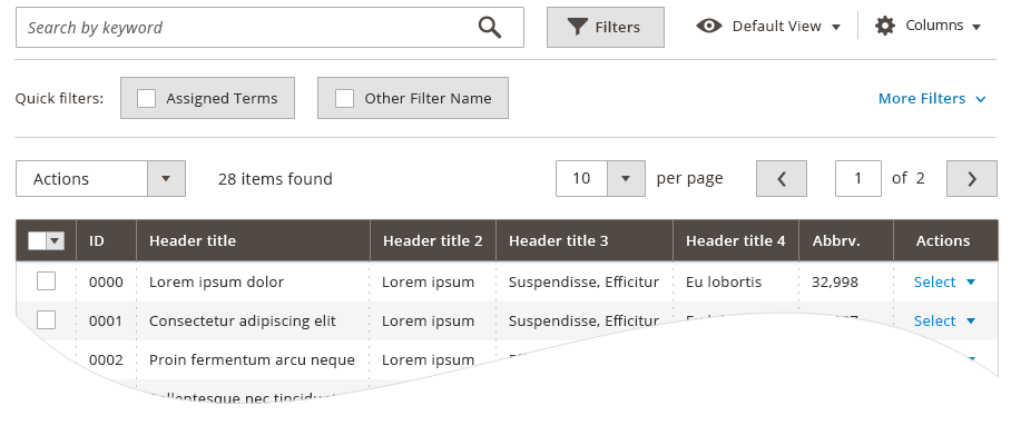 A search box associated with a data-table allows users to filter table data by entering a term(s) in the field and clicking/tapping the search icon. The table refreshes to display only rows of data that have a relationship to this ‘keyword’. The term(s) is displayed as a filter ‘tag’ in an area just beneath the search box. Users may add subsequent search terms to create a combination of filtering parameters to more specifically filter data.