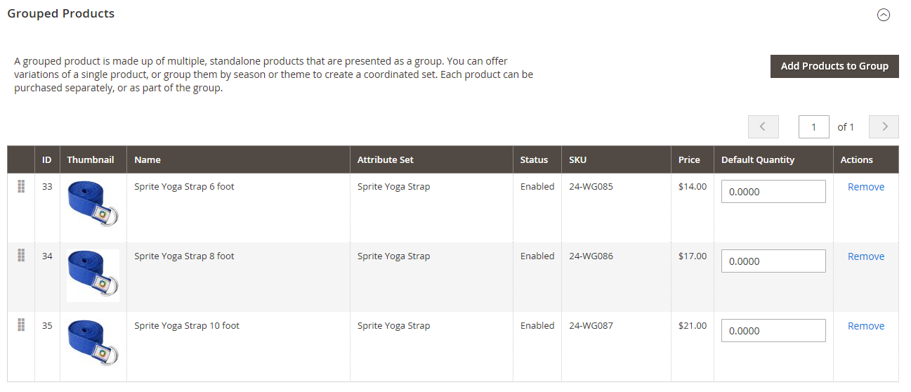 The Grouped Products section is used to add individual products to a Grouped product. After the products are added, they appear in the Grouped Products section.