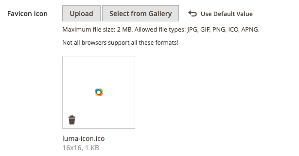 A favicon is generally 16 x 16 pixels or 32 x 32 pixels in size. Magento accepts ICO, PNG, APNG, GIF, and JPG (JPEG) file types, although not all browsers support these formats. The most widely-supported file format to use for a favicon is ICO. You can use other image file types, but the format might not be supported by all browsers. There are many free tools available online that you can use to generate an ICO image or convert an image to that format.