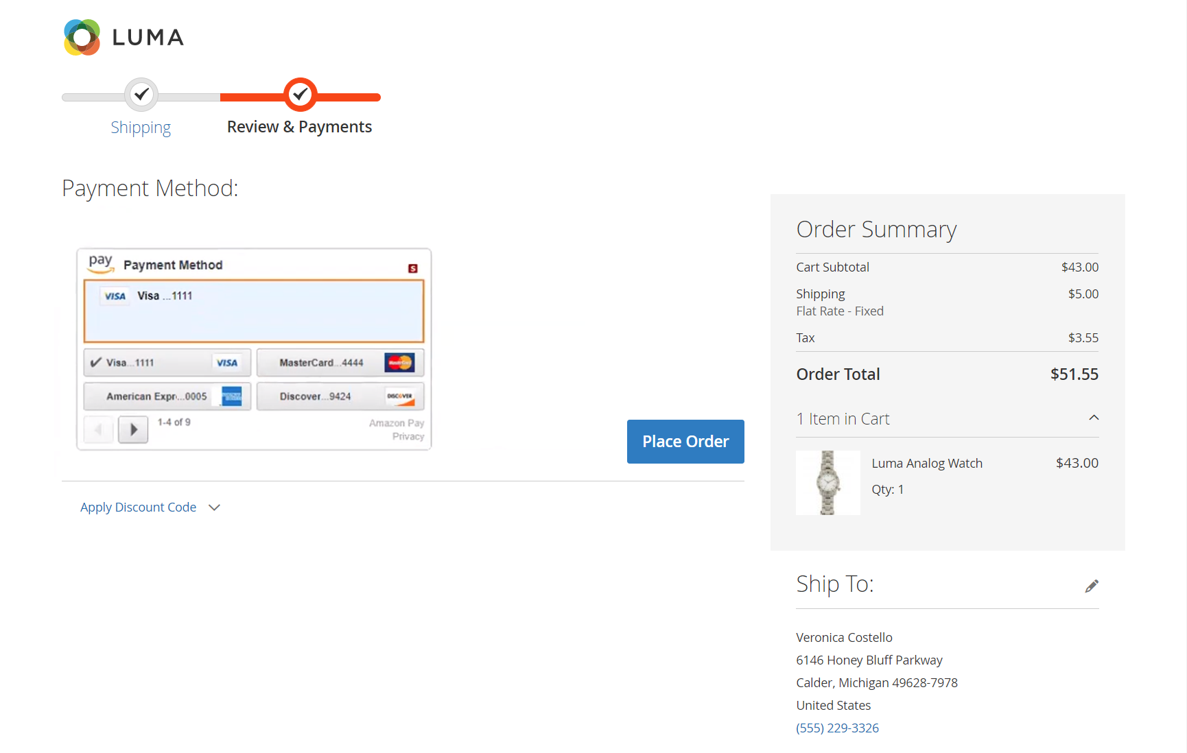 The following information describes the customer experience using Amazon Pay when placing an order from the Magento storefront.