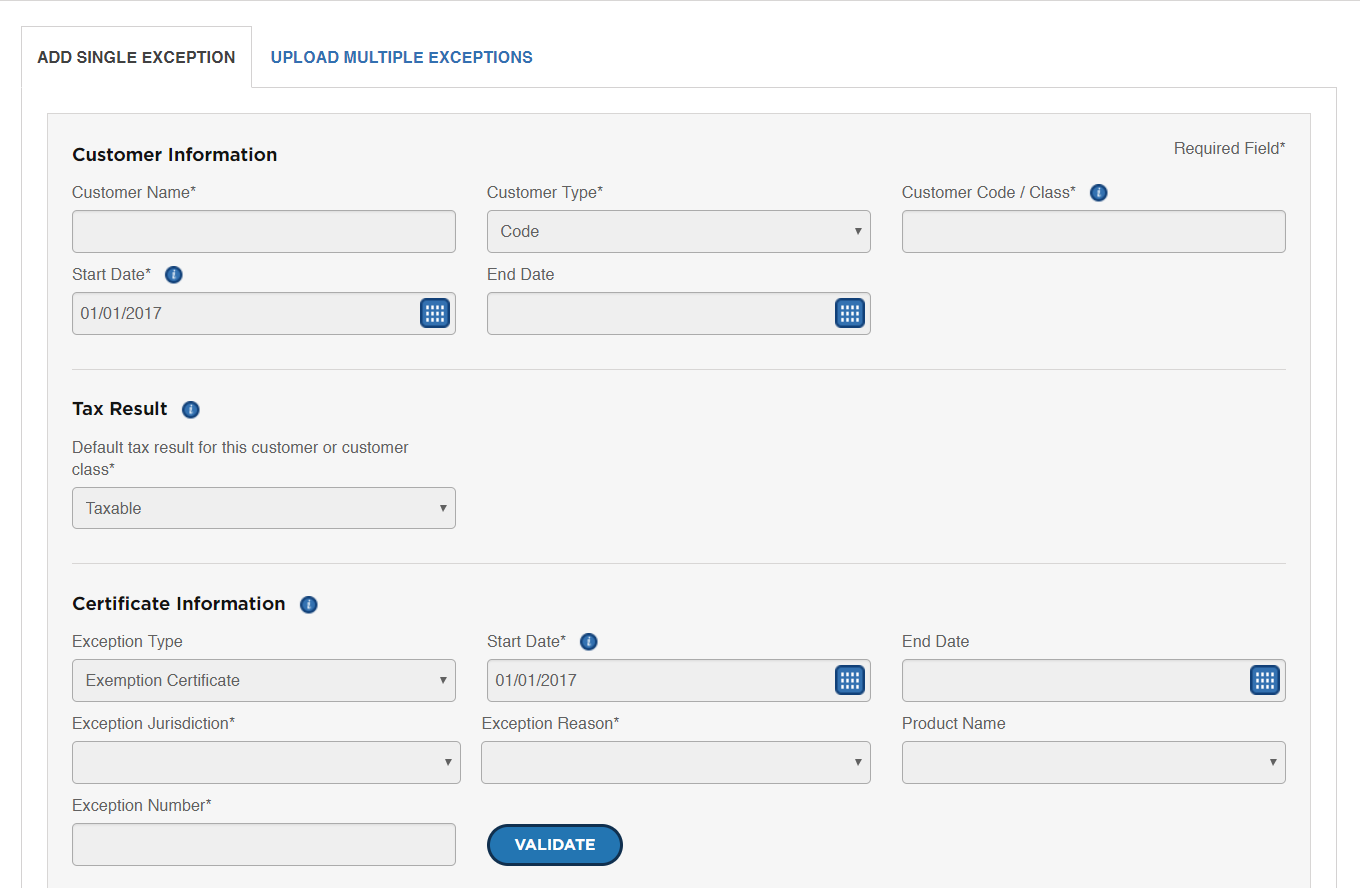 Direct Pay Permit - A direct payment permit is used when the buyer cannot determine at the time of purchase if the items are for resale. The permit certifies that the buyer has permission to purchase the items without paying sales or use tax at the time of purchase. The payment is deferred, and then paid directly to the tax authority, as applicable.Start Date The date the customer exception becomes available to Vertex Cloud for tax calculations and reporting. End Date (Optional) The date the customer exception is no longer available to Vertex Cloud for tax calculations and reporting. Exception Jurisdiction The state or territory where the exception applies. Exception Reason A code that identifies the reason why the customer is exempt from filing returns. For the Direct Pay Permit exception type, the default reason is Direct Pay Permit. For more information, see the following: Exemption Reasons - United States, Exemption Reasons - U.S. Territory (Puerto Rico), and Exemption Reasons - CanadaProduct Name (Optional) Associates a specific product with the customer exception. Options: All products that are currently mapped to Vertex Cloud. Exception Number The unique number that is assigned to your exception certificate. For example: Your resale number. Validate Validates that the certificate information is correct. Certificate reporting criteria